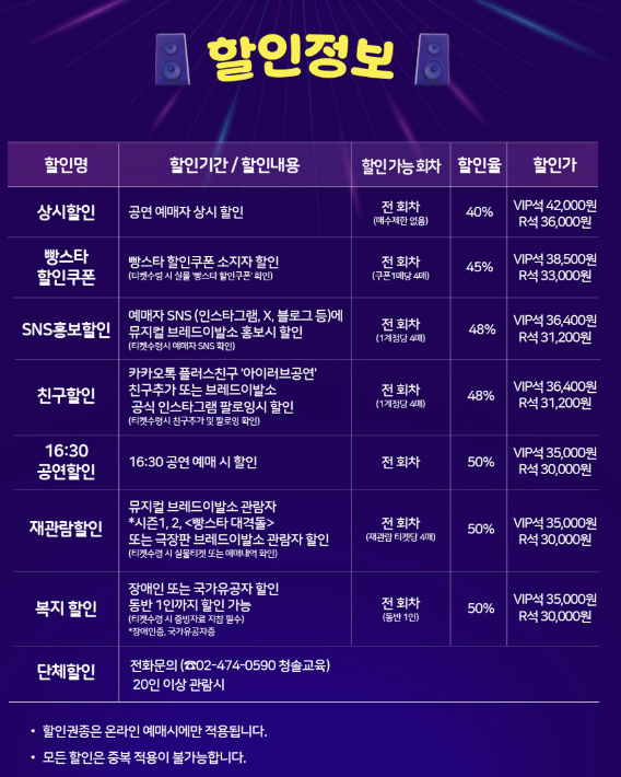 - 주차 할인: 공연 티켓 제시 시 공연장 주차비 50% 할인 제공.